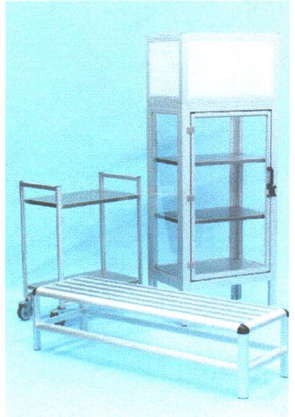 HEPA filtered storage cabinet, Aluminum Bootie Bench.