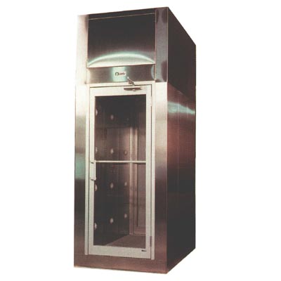 304-2B 16 gauge stainless steel construction with doors - heavy duty anodized aluminum, 3/16" safety glass. Available with option of left or right door swings. Doors have magnetic interlocks. Operation can be changed from 1 way to 2 way without changing electrical parts Outside dim, - H: 120", W: 48", Door-to-Door: 48". Inside dim, W: 36", Door-to-Door: 441T, H: 84". 5' and 6' width configurations available. Standard operating time 0 -120 seconds. Air Shower delivers moving air at approx, 7500 fpm from 30 adjustable plastic louvers located in ceiling and sidewalls. Return air grilles located in the walls of air shower. Air filtered through prefilters and HEPA filters is 99.99% efficient in removal of particles to 0.3 micron. Direct drive, self-cleaning, high-pressure radial vane blower, AS-200ESS shipped disassembled in 5 pieces for on-site assembly. Air Shower incorporates a control panel plug-in system requiring a single location power source. Fluorescent lighting, 3 phase 208/220 volts, approx 10 amp run, 440/480 volts 3 phase 60 HZ, run amp 5.0. Painted Cold rolled steel, optional. Different gauges and finishes in stainless steel are quoted on request.